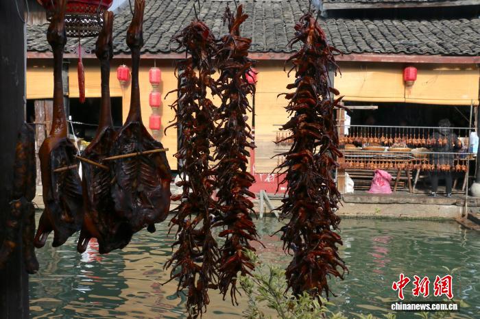 今日住户挂晒酱鸭。中新社记者 项菁 摄